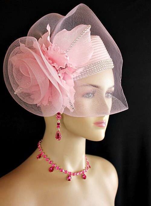 Women’s Designer Soft Pink Formal Straw Braid Special Occasion Wedding Pillbox Cocktail Hat Wedding Fascinator Bridal Headpiece. This Couture Pink Church Hat Is Embellished With A Large Pink Crinoline Horsehair Large Rose Bow. Beautiful Hand Dyed Pink Vintage Silk Orchid Millinery Flowers Are Placed Within The Bow, Enhanced With Pink Vintage Silk Leaves Accented With A Single Row Of Acrylic Rhinestones. Four Rows Of Acrylic Rhinestones Encircle The Crown Of This Fashion Wedding Headpiece. This Formal 1920’s Flapper Art Deco Styled Hat Wedding Headpiece Can Be Worn In Different Positions.